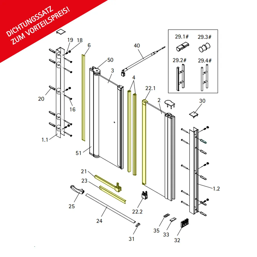 Zur kompletten Erneuerung der Abdichtungen Ihrer Walk In Drehfalttür der Serie Garant. Mit dem Einsatz dieses Dichtungssatzes wird ein zuverlässiger Spritzschutz erreicht.