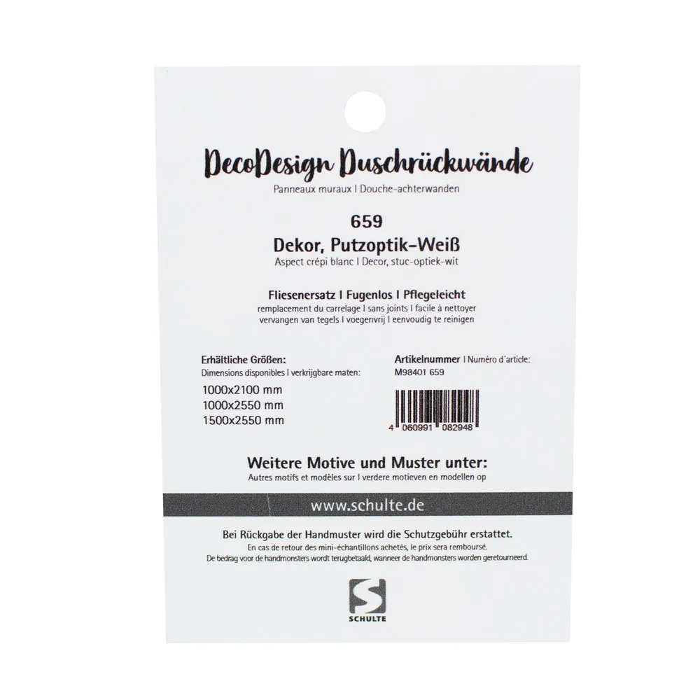 Unsere hochwertigen Duschrückwand-Muster helfen Ihnen, Farbe, Dekor und Oberfläche Ihrer zukünftigen Duschrückwand realistisch zu erleben. Wählen Sie aus glänzend, hochglänzend, matt, 3D-strukturiert oder Softtouch – und sehen Sie originalgetreu, wie das Material in Ihrem Badezimmer wirken wird. Ideal, um vor der Bestellung die passende Duschrückwand-Optik zu finden – ob für eine moderne, elegante oder individuelle Badgestaltung.