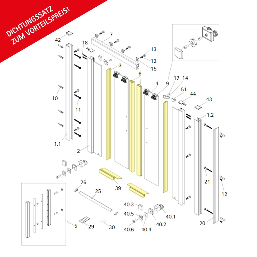 Dichtungssatz für 6/8 mm Schiebetür, 4-teilig in Nische, ohne unteres Profil