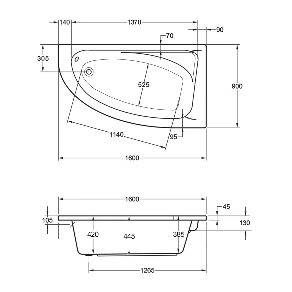 Badewanne - Baia, Alpinweiß, rechte Ausführung, 1600x900 mm, inkl. Fußgestell und Ab- /Überlauf