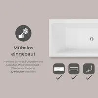 - Lieferumfang 1 x Badewanne, 1 x Fußgestell, 1 x Ab- /Überlauf („Pop-Up“-Ventil und Schlitzüberlauf), 1 x Schürze (vormontiert)