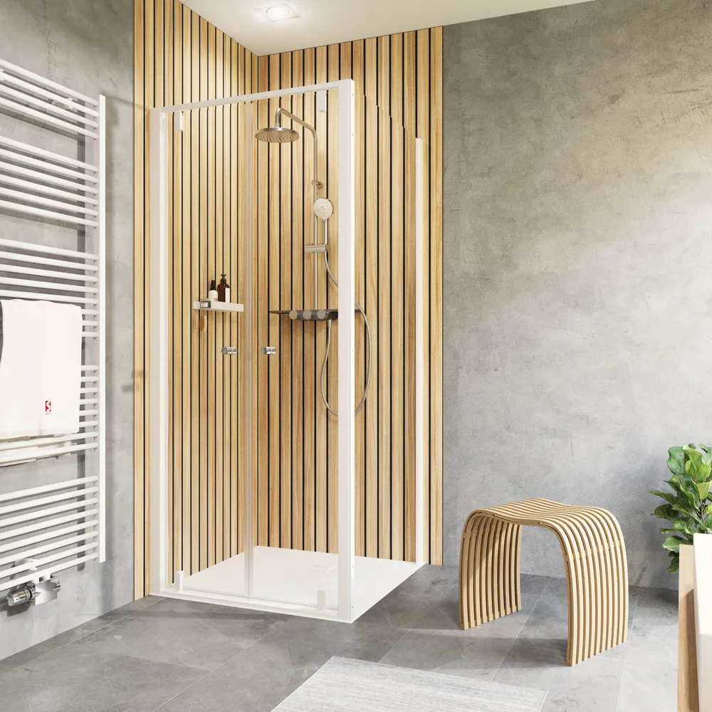 Trend 2.0 - Drehpunkt-Pendeltür mit Seitenwand, 750-1200 mm, Mattweiß, Klar hell, versiegelt