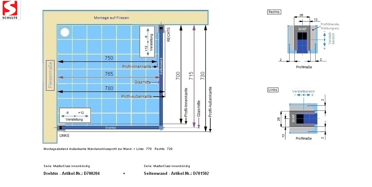 785-805 mm - Fliesenmaß Glasmitte links 765 mm