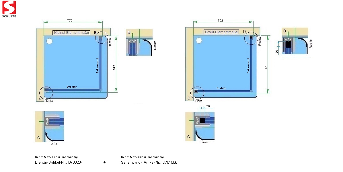 MasterClass - Drehtür an Nebenteil für SeitenwandDuschkabinenserie MasterClass Die Serie MasterClass gilt als Luxusklasse der Marke Schulte. Die teilgerahmte Optik der Duschkabinen mit innenbündigen Scharnieren bietet den praktischen Vorteil, dass die Duschabtrennungen ausgesprochen pflegeleicht sind; Schmutz und Kalk können sich nur schwer absetzen. Außerdem ist eine ebenerdige beziehungsweise barrierefreie Montage auf Fliesen sowie eine Montage auf unseren Duschwannen bei allen MasterClass-Modellen möglich. Sie haben zudem die Wahl die Duschkabine mithilfe der mitgelieferten Montageanleitung selbst anzubringen oder unsere fachkundigen Monteure zu buchen.