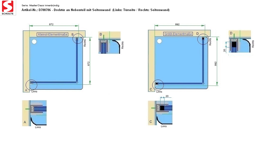 MasterClass - Drehtür an Nebenteil mit SeitenwandDuschkabinenserie MasterClass Die Serie MasterClass gilt als Luxusklasse der Marke Schulte. Die teilgerahmte Optik der Duschkabinen mit innenbündigen Scharnieren bietet den praktischen Vorteil, dass die Duschabtrennungen ausgesprochen pflegeleicht sind; Schmutz und Kalk können sich nur schwer absetzen. Außerdem ist eine ebenerdige beziehungsweise barrierefreie Montage auf Fliesen sowie eine Montage auf unseren Duschwannen bei allen MasterClass-Modellen möglich. Sie haben zudem die Wahl die Duschkabine mithilfe der mitgelieferten Montageanleitung selbst anzubringen oder unsere fachkundigen Monteure zu buchen.
