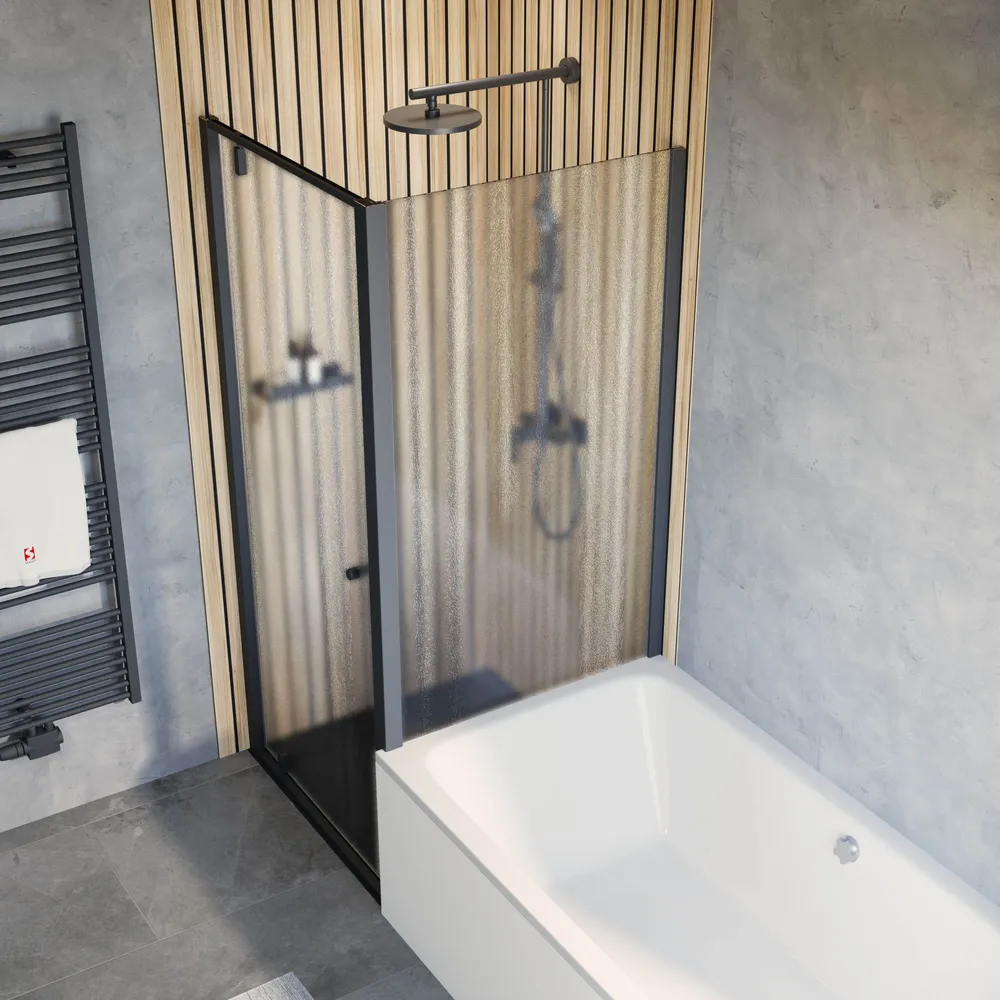 Trend 2.0 - Drehtür inklusive verkürzter Seitenwand, 800x800 mm, 2000/1750 mm, Mattschwarz, Bella (Chinchilla-Struktur), versiegelt