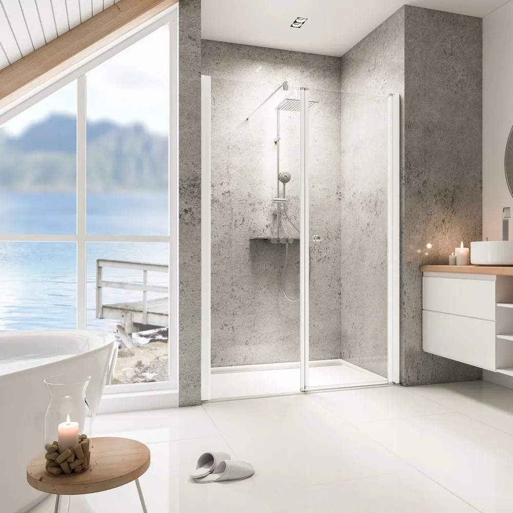 - Langlebiges, qualitativ hochwertiges Drehlager mit integriertem Heb-Senk-Mechanismus: verbesserte Dichtigkeit, reduzierter Verschleiß, komfortables Bewegen der Duschtür