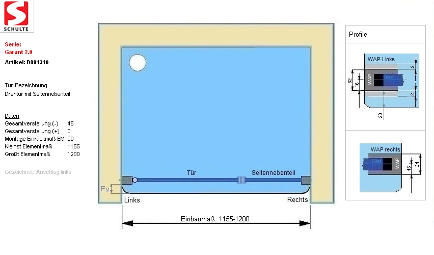 Scharnierform und Verstellbereich können einen entscheidenden Unterschied in der Bemaßung machen. Wenn Sie unsicher sind, wenden Sie sich bitte direkt an unseren Service.