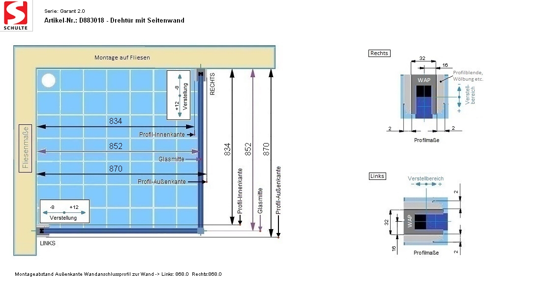 770 mm - Fliesenmaß Glasmitte links 852 mm