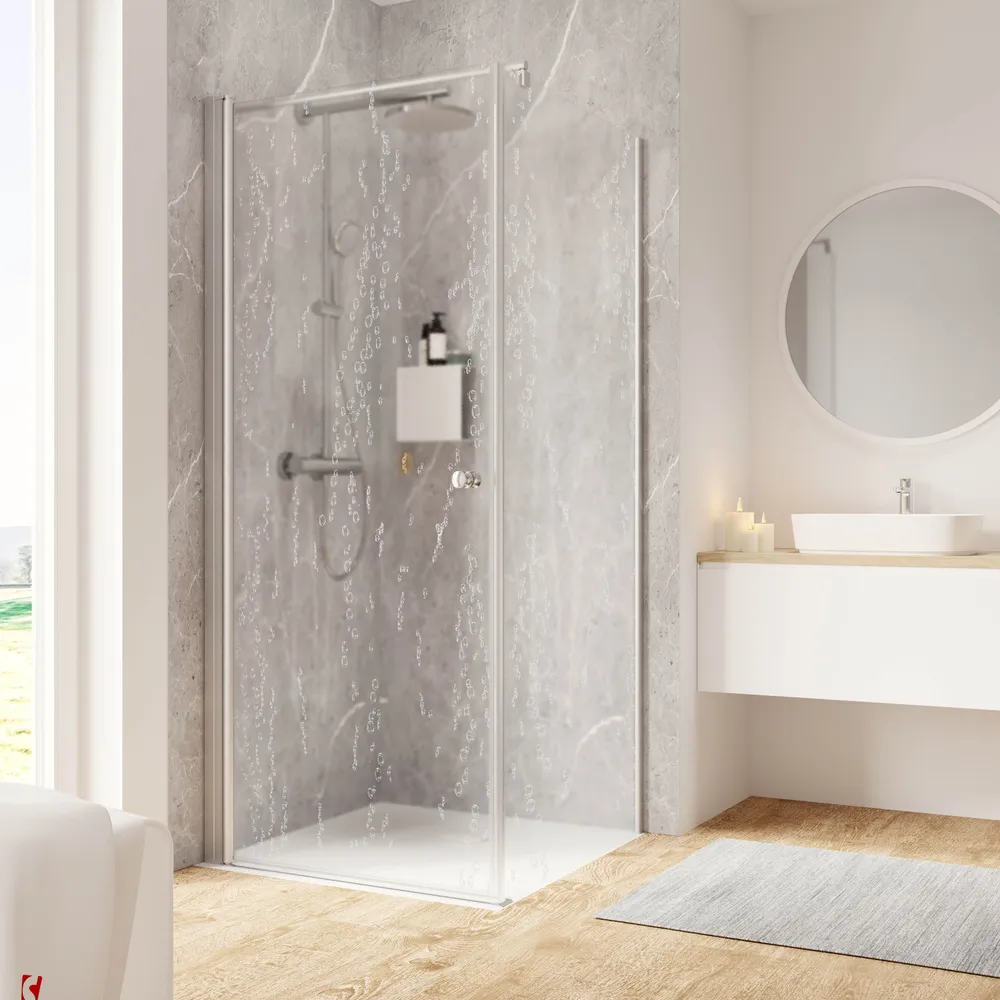 Garant 2.0 - Drehtür mit schwenkbarer Seitenwand, 550-1200 mm, Alu-Natur, Tropfen hell