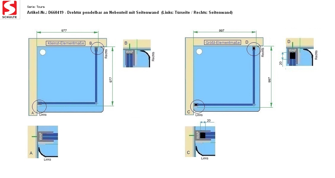 - versetzter Drehpunkt der Tür eignet sich optimale bei bestehenden Regalen, Waschtischen, Heizkörpern etc. im Wandanschlussbereich vor der Duschtür