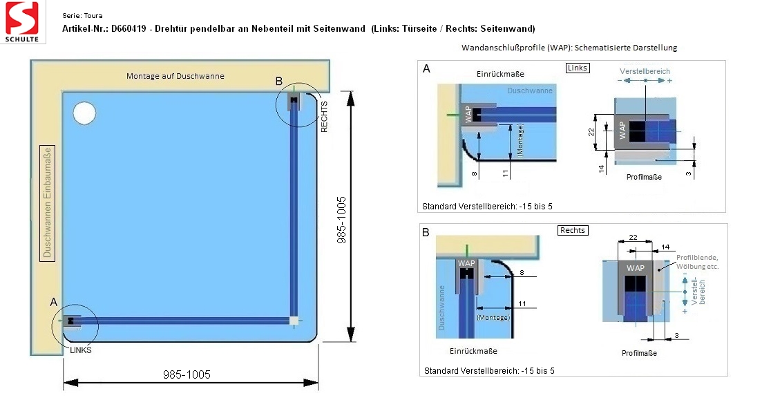 985-1005 mm - Duschwanneneinbaumaß (rechts) 985-1005 mm