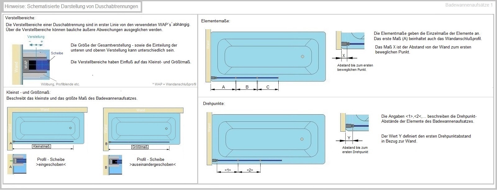 Hinweis: Beim Klick auf den Info-Button (i) erhalten Sie weitere Informationen zu den Begrifflichkeiten. Das Wanneneinbaumaß gibt an, für welche Duschwannengröße eine Duschabtrennung verwendet werden kann. Sofern Ihr „lichtes Maß“ (Maßbereich von Wandfliese bis Außenkante der Duschwanne (äußere Rundungen an den Ecken ebenfalls berücksichtigen); also das Ist-Maß der Duschwanne nach Einbau) in dem angegebenen Duschwanneneinbaumaß der Duschkabine liegt, kann diese auf Ihrem Duschwanne angebracht werden. Duschwanneneinbaumaß (links) Auflagefläche des Profils an der Wand. Wandanschlussprofilbreite (links)