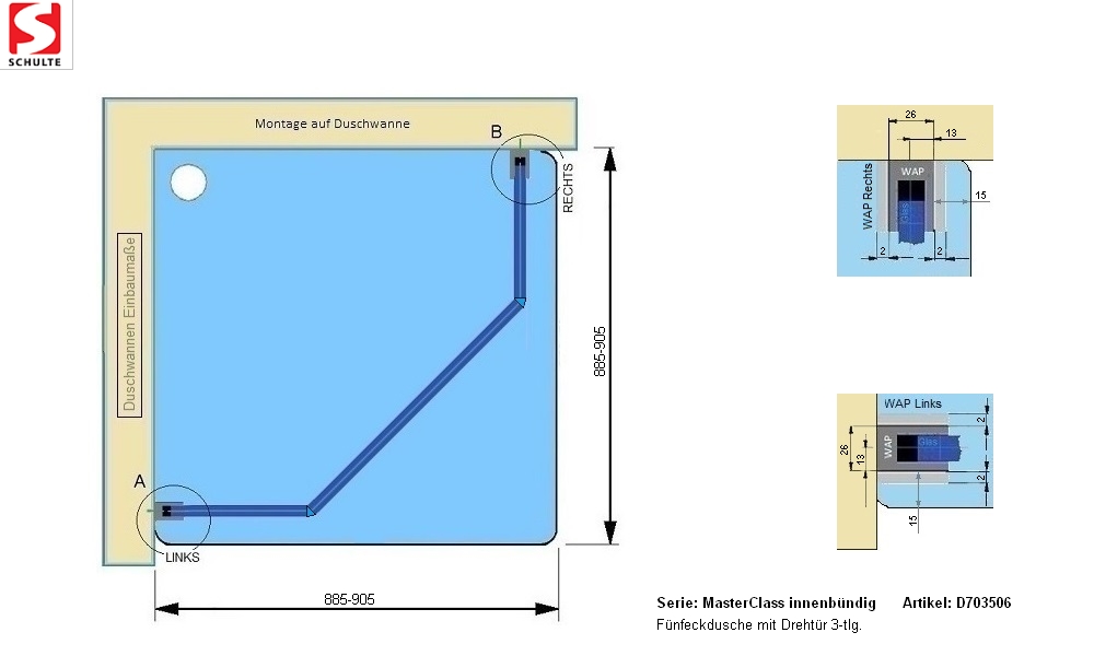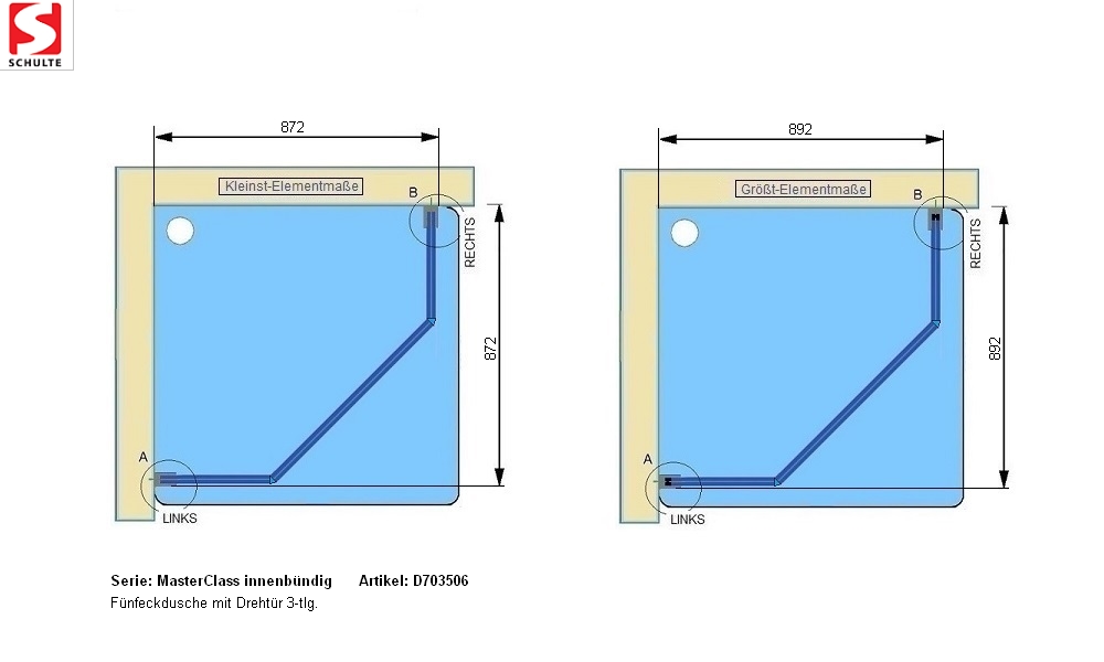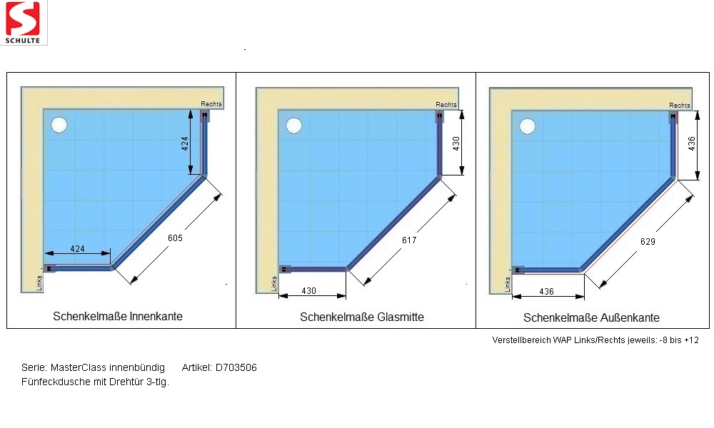 MasterClass - Fünfeckdusche, 3-teilig bis 707 mm TürbreiteDuschkabinenserie MasterClass Die Serie MasterClass gilt als Luxusklasse der Marke Schulte. Die teilgerahmte Optik der Duschkabinen mit innenbündigen Scharnieren bietet den praktischen Vorteil, dass die Duschabtrennungen ausgesprochen pflegeleicht sind; Schmutz und Kalk können sich nur schwer absetzen. Außerdem ist eine ebenerdige beziehungsweise barrierefreie Montage auf Fliesen sowie eine Montage auf unseren Duschwannen bei allen MasterClass-Modellen möglich. Sie haben zudem die Wahl die Duschkabine mithilfe der mitgelieferten Montageanleitung selbst anzubringen oder unsere fachkundigen Monteure zu buchen.