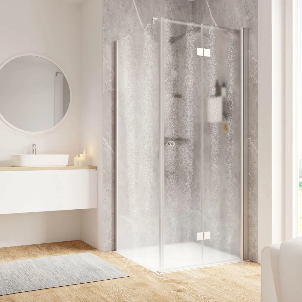 Garant 2.0 - Drehfalttür 2-tlg. mit Seitenwand, 900x900 mm, 2000 mm, Scharnier Halbkreis, Alu-Natur, Bella