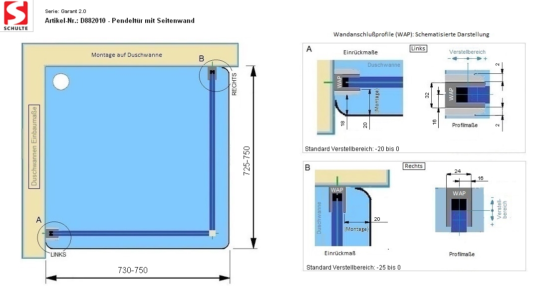 725-750 mm - Duschwanneneinbaumaß (rechts) 730-750 mm