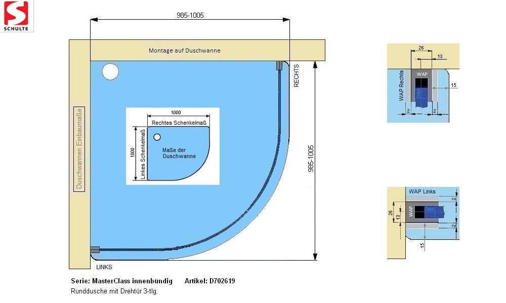 MasterClass - Runddusche, 3-teiligDuschkabinenserie MasterClass Die Serie MasterClass gilt als Luxusklasse der Marke Schulte. Die teilgerahmte Optik der Duschkabinen mit innenbündigen Scharnieren bietet den praktischen Vorteil, dass die Duschabtrennungen ausgesprochen pflegeleicht sind; Schmutz und Kalk können sich nur schwer absetzen. Außerdem ist eine ebenerdige beziehungsweise barrierefreie Montage auf Fliesen sowie eine Montage auf unseren Duschwannen bei allen MasterClass-Modellen möglich. Sie haben zudem die Wahl die Duschkabine mithilfe der mitgelieferten Montageanleitung selbst anzubringen oder unsere fachkundigen Monteure zu buchen.