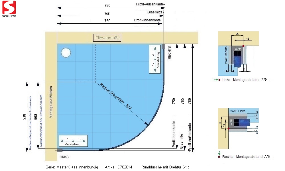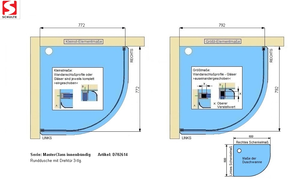 MasterClass - Runddusche, 3-teiligDuschkabinenserie MasterClass Die Serie MasterClass gilt als Luxusklasse der Marke Schulte. Die teilgerahmte Optik der Duschkabinen mit innenbündigen Scharnieren bietet den praktischen Vorteil, dass die Duschabtrennungen ausgesprochen pflegeleicht sind; Schmutz und Kalk können sich nur schwer absetzen. Außerdem ist eine ebenerdige beziehungsweise barrierefreie Montage auf Fliesen sowie eine Montage auf unseren Duschwannen bei allen MasterClass-Modellen möglich. Sie haben zudem die Wahl die Duschkabine mithilfe der mitgelieferten Montageanleitung selbst anzubringen oder unsere fachkundigen Monteure zu buchen.