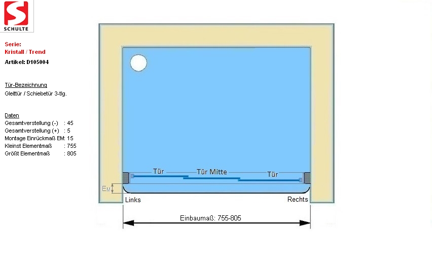 Kristall/Trend - Schiebetür, 3-teilig in Nische oder verkürzte SeitenwandDuschkabinenserie Kristall/Trend Unsere moderne Duschkabinenserie Kristall/Trend ist mit umlaufenden Aluminiumprofilen ausgestattet, welche mit den Glaselementen – ganz gleich, ob es sich um eine Variante mit Echtglas (Sicherheitsglas, ESG) oder Kunstglas handelt – perfekt harmonieren. Die hochwertigen Aluminiumprofile und der umlaufende Magnetverschluss verleihen den Duschen der Serie zudem eine hohe Dichtigkeit und gewährleisten ein zuverlässiges Schließverhalten. Kristall/Trend-Duschkabinen können wahlweise in Eigenregie mithilfe unserer Montageanleitung angebracht werden oder durch unsere Servicetechniker. Hierfür buchen Sie einfach unseren zuverlässigen Montageservice.