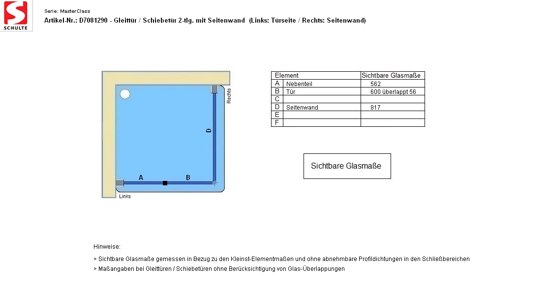 Scharnierform und Verstellbereich können einen entscheidenden Unterschied in der Bemaßung machen. Wenn Sie unsicher sind, wenden Sie sich bitte direkt an unseren Service.