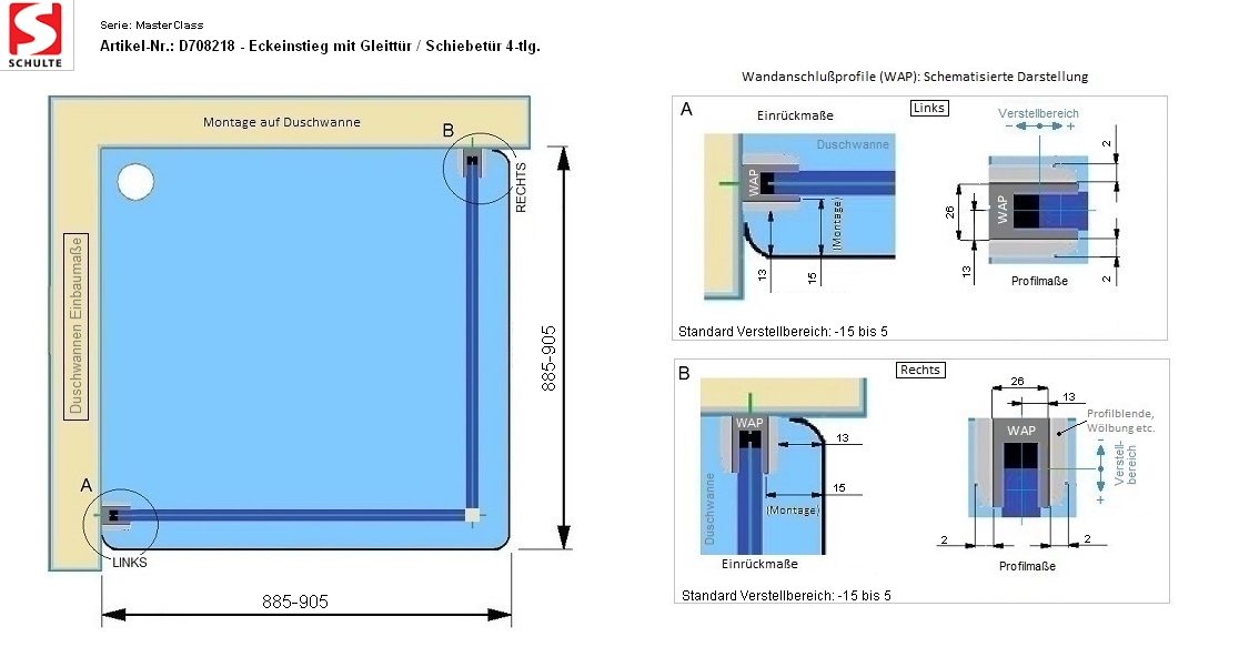 885-905 mm - Duschwanneneinbaumaß (rechts) 885-905 mm