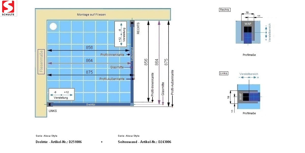 900 mm - Fliesenmaß Glasmitte links 857 mm