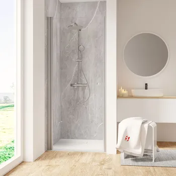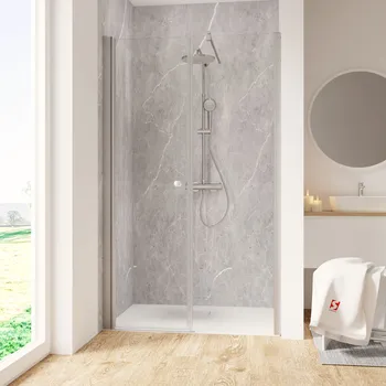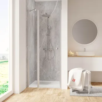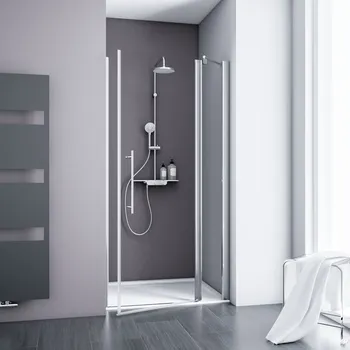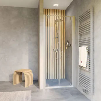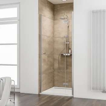 - Klapptür: Unsere Klapptüren eignen sich vor allem für kleine Bäder. Bestehend aus zwei Elementen, lässt sich diese Duschtüre problemlos nach innen öffnen. So verhindern Sie, dass Ihre Duschtüre gegen die Wand, ein Regal, einen Heizkörper oder etwas anderes im Außenbereich stößt. Durch die Öffnung nach innen wird kein zusätzlicher Platz eingenommen. Außerdem kann das Wasser beim Lüften problemlos nach innen abtropfen, wodurch sich keine unnötige Pfütze in Ihrem Badezimmer bildet.
