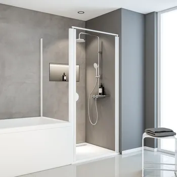 Die Sunny Drehtür mit Seitenwand ist ebenfalls ein attraktives Einsteigemodell, das es auch mit verkürzter Seitenwand gibt, um die Dusche mit einer Badewanne zu kombinieren. Alternativ bietet sich das Modell mit Pendeltür im 2-teiligen Set an. Letztere lässt sich nach innen und außen öffnen, um den Einstieg zu erleichtern. Alle Varianten können Sie individuell nach Maß von uns einbauen lassen. Sie eignen sich auch für die Nische und sind mit Pendeltür oder Drehtür im Angebot enthalten.