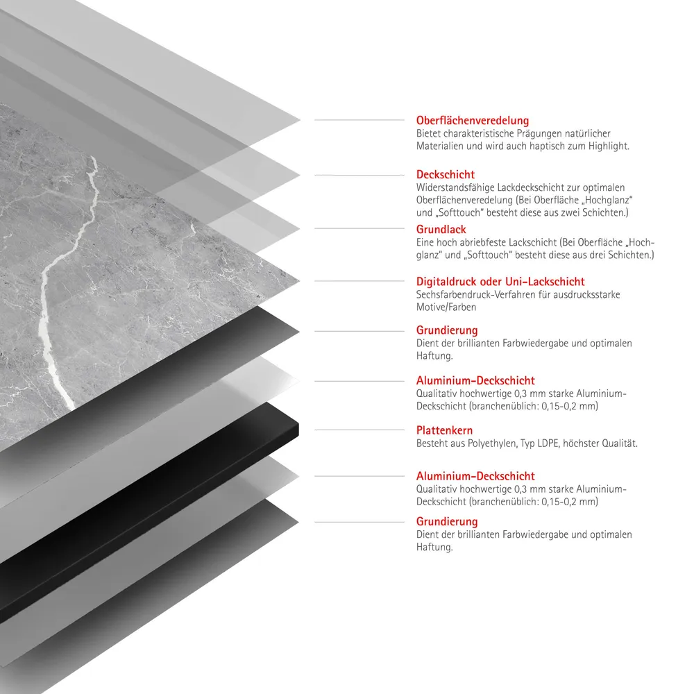 Die Duschrückwand „Stein Marmor-Grau“ unserer Serie DecoDesign Softtouch überzeugt sowohl mit einer edlen Optik als auch einer zarten Haptik, welche an Seide erinnert. Neben der außergewöhnlich eleganten Beschaffenheit überzeugt unsere Edition Softtouch außerdem mit einer widerstandsstarken und unempfindlichen Oberfläche, die weder anfällig für Kratzer noch Verschmutzungen ist. Mit dieser Dekorwand der Serie DecoDesign Softtouch erhalten Sie eine zuverlässige Wandverkleidung, die Ihre Räumlichkeiten optisch aufwertet und an der Sie sich langfristig erfreuen werden.