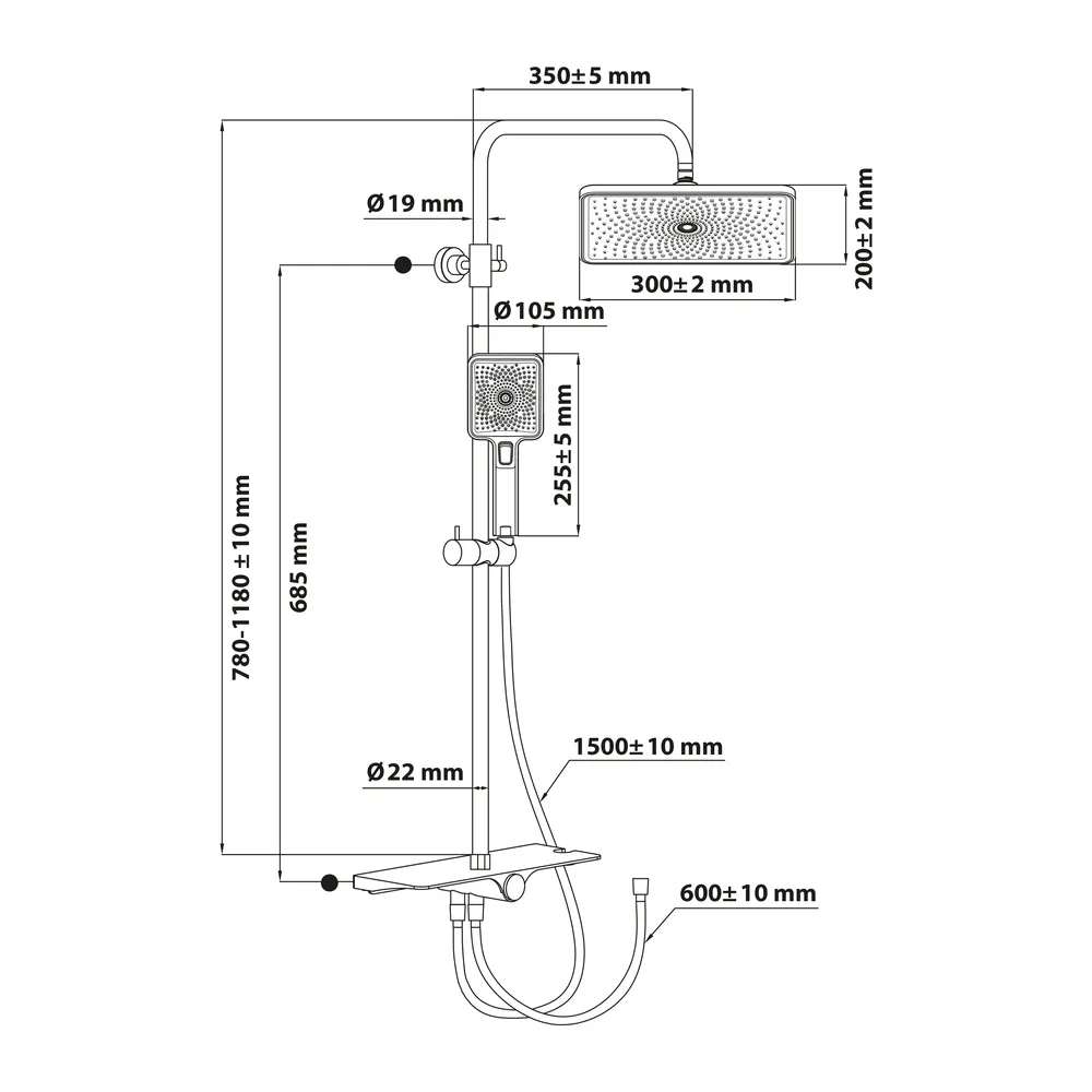 Integrierte Ablage für Duschutensilien sowie höhenverstellbare Handbrausenhalterung für zusätzlichen Komfort.