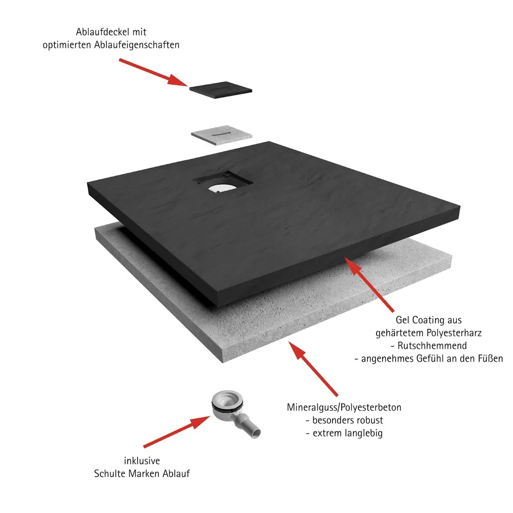 Duschwanne aus Mineralguss mit Steinstruktur - Quadrat, Anthrazit, 900x900 mm