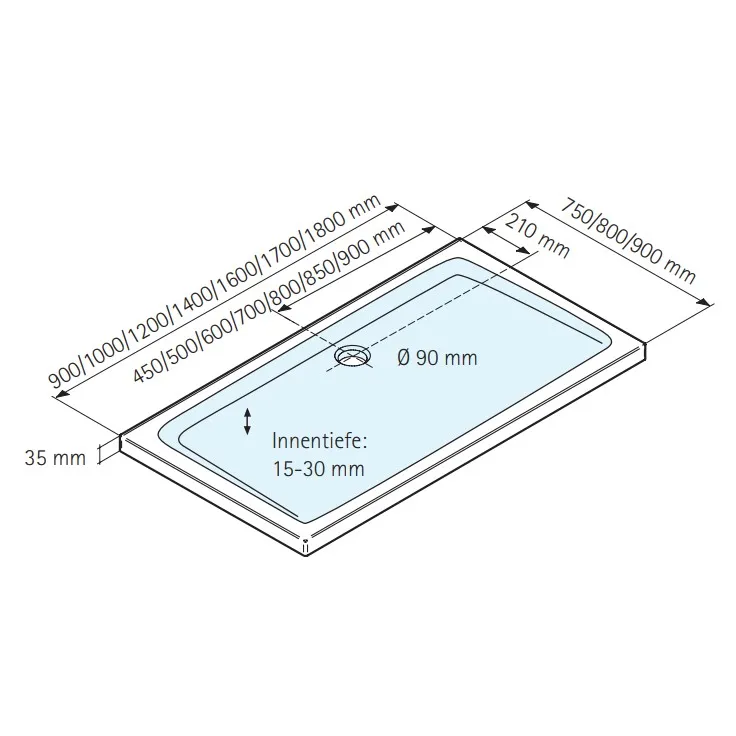1800 mm - Ablaufposition Mittig (lange Seite)