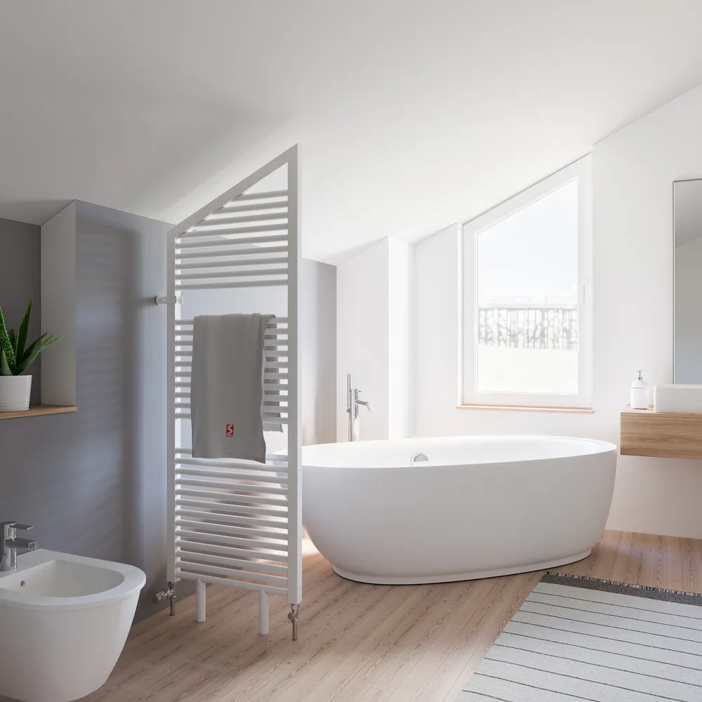Mit unseren optionalen Wandhalterungen haben Sie die Option, unseren Heizkörper München als Raumteiler für eine Einbausituation mit Schräge zu nutzen. Auf diese Weise haben Sie die Möglichkeit, den praktischen Handtuchhalter und Heizkörper zugleich als schönen Raumteiler zu nutzen. So können Sie etwa in Ihrem Bad, das WC räumlich vom Waschtisch trennen.