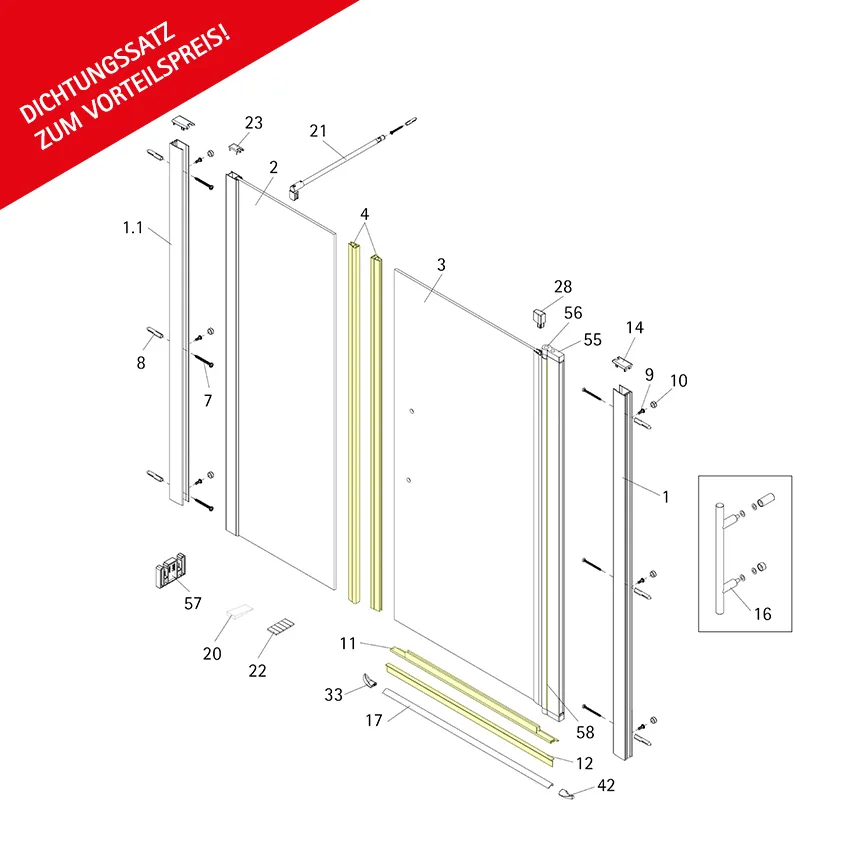 Zur kompletten Erneuerung der Abdichtungen Ihrer Drehtür mit Nebenteil der Serie Alexa Style 2.0. Mit dem Einsatz dieses Dichtungssatzes wird ein zuverlässiger Spritzschutz erreicht.