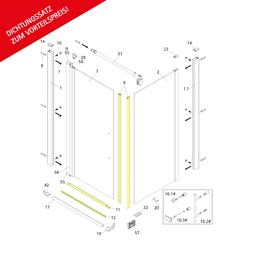 Zur kompletten Erneuerung der Abdichtungen Ihrer Drehtür inklusive Seitenwand der Serie Alexa Style 2.0. Mit dem Einsatz dieses Dichtungssatzes wird ein zuverlässiger Spritzschutz erreicht.