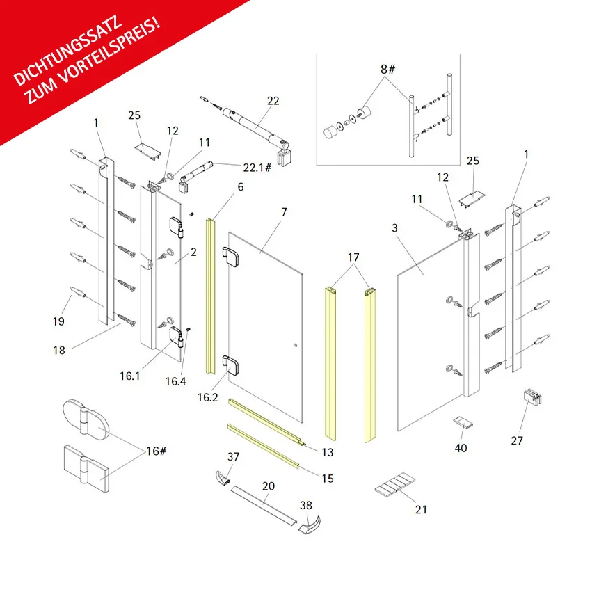 Das Dichtungsset enthält folgende Positionen aus der Montageanleitung 1105 &1106 (mit verkürzter Seitenwand neben Badewanne) &1209 (inklusive 2 Seitenwänden als U-Kabine):