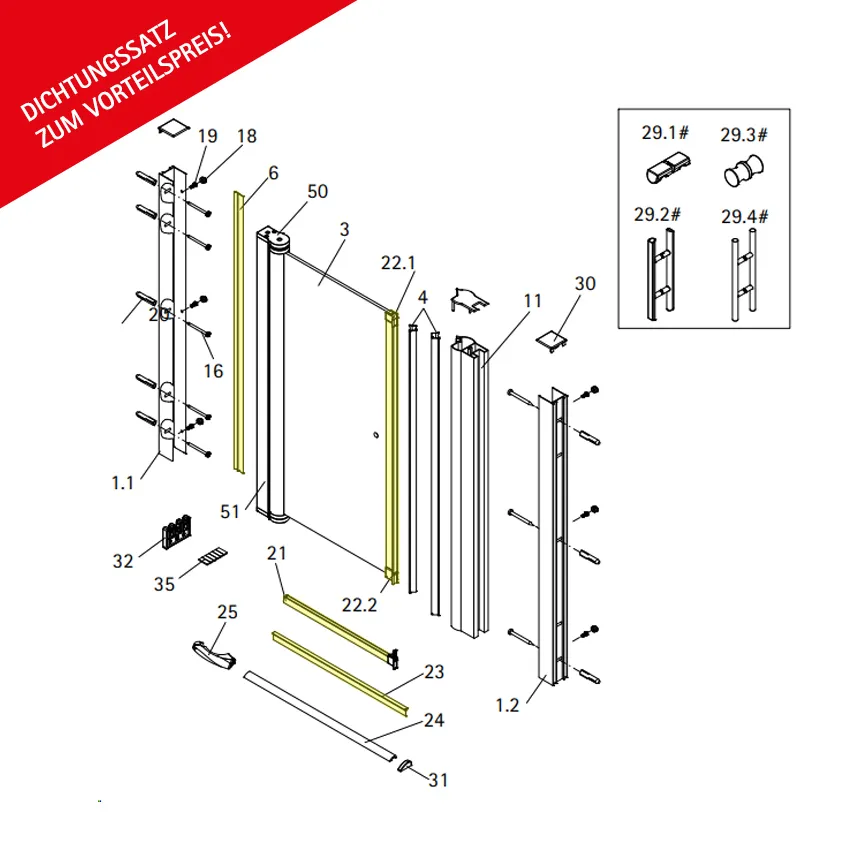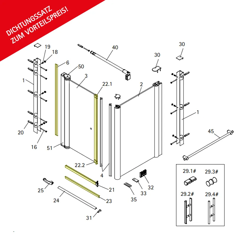 Das Dichtungsset enthält folgende Positionen aus der Montageanleitung 1470 &1469 (mit gleichhoher Seitenwand) &1472 (mit verkürzter Seitenwand auf Badewanne) &1489 (Drehtür an Nebenteil):