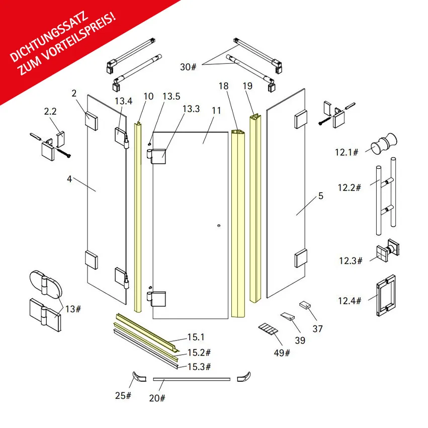 Zur kompletten Erneuerung der Abdichtungen Ihrer Für Ihre Fünfeckdusche, 3-teilig der Serie Davita. Mit dem Einsatz dieses Dichtungssatzes wird ein zuverlässiger Spritzschutz erreicht.