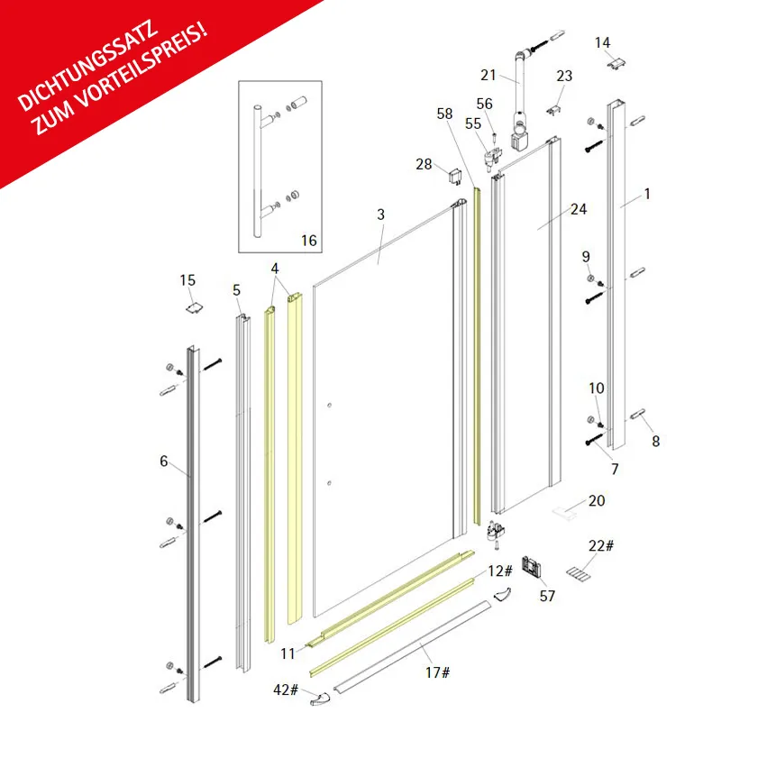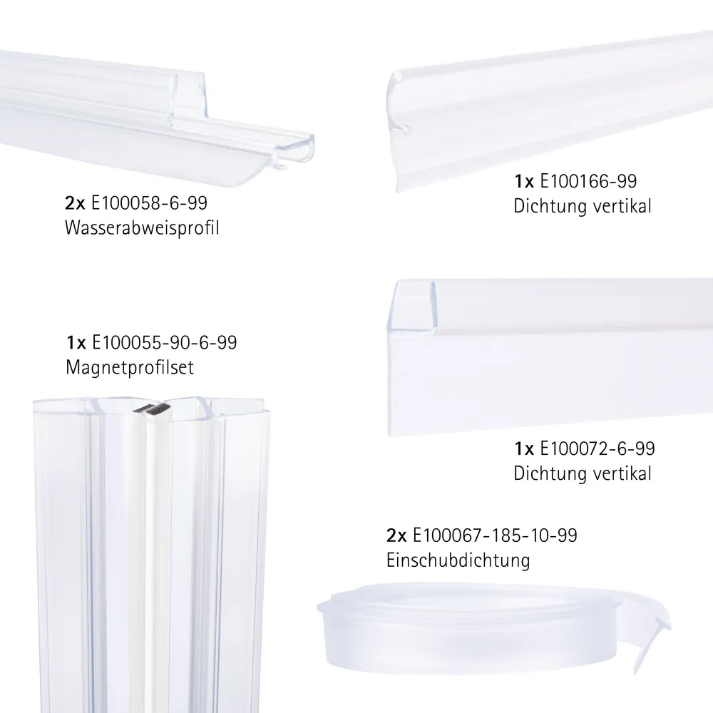 Zur kompletten Erneuerung der Abdichtungen Ihrer Drehfalttür in Nische aus der Serie Garant. Mit dem Einsatz dieses Dichtungssatzes wird ein zuverlässiger Spritzschutz erreicht.