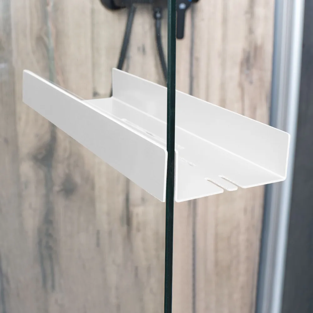 Duschablage „über Eck“ in MattweißMattschwarz und Edelstahloptik