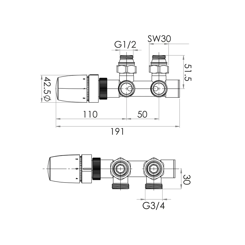 Designthermostatfühler mit Thermostatventil für Einzelanschluss. Geeignet für Zweirohrsysteme. Das Vorlauf-Eckventil ist hier voreinstellbar und das Rücklauf Eckventil ist absperrbar.
